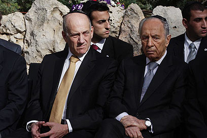Olmert (L), Peres at the service (photo: Gil Yohanan)