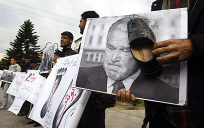 (Video) Journalist Muntadhar al-Zeidi, who hurled shoes at outgoing US president in Iraq, sparks wave of support in Strip. 'There's nothing better than this shoe to summarize what the Arab world thinks about this foolish president,' Gaza rally organizer tells Ynet