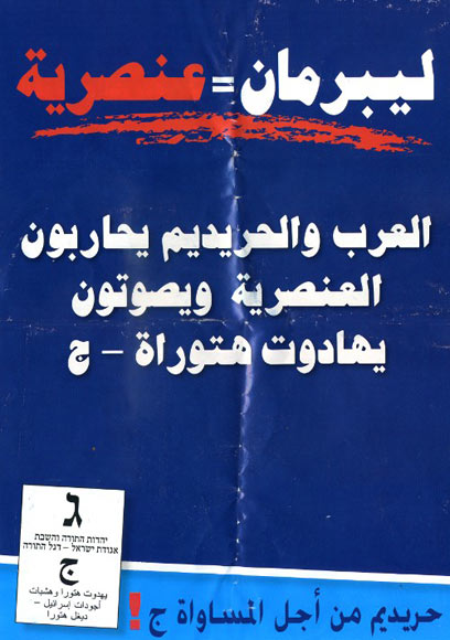 The party stated it would protect the Arab sector's interests againt Yisrael Beiteinu's manifest. Some of the party's flyers label rival party leader Avigdor Lieberman a racist, and state that "Arabs and haredim fight racism – vote United Torah Judaism."
