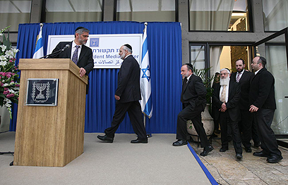Shas members leaving Peres's office (Photo: Gil Yohanan)