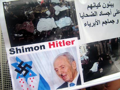 The signs included some showing Peres beside the Israeli flag with a swastika drawn on it and the president drawn with a mustache similar to that of Adolf Hitler and the text "Shimon Hitler". Other signs showed charred children's bodies.