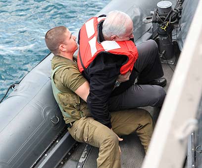 Netanyahu visited the Haifa Navy base on Tuesday, along with IDF Chief of Staff Gabi Ashkenazi and Israeli Navy Commander Eli Marom. After touring the missile boat and speaking of the dangers of disobedience in the military, the prime minister's hosts also wished to show him the inflatable boat the fleet uses.