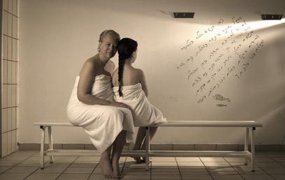 Nesher photographs female Israeli novelists and poets, with a word or sentence carrying a personal significant meaning written on their skin or located in the nearby space.