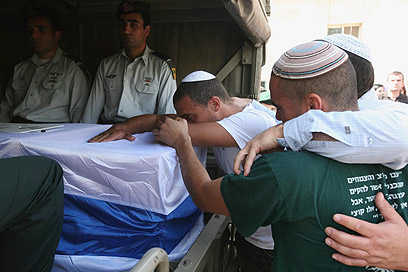 Eliraz's brothers crying over coffin (Photo: Gil Yohanan)
