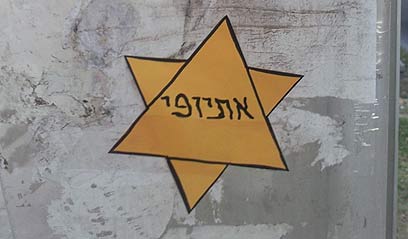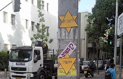 Dozens of yellow patches in the shape of Jewish stars, similar to those Jews were forced to wear during the Holocaust as a source of public humiliation, were hung throughout the night on Rothschild Boulevard and the outlying streets by anonymous people.