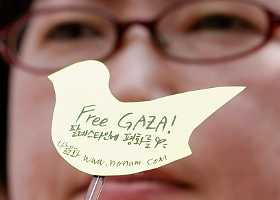 Earlier Thursday, some 50 people protested outside the Israeli embassy in Seoul, and defaced the Israeli flag with blood-colored paint and called Peres a "killer".