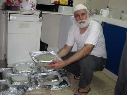 Gaza sheikh al-Fara with donated tin-foiled dinners for patients (Photo: Anne Usher)