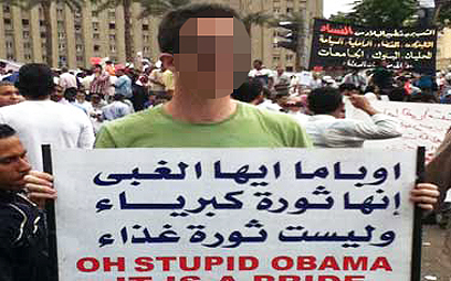 In the photos published by Egypt's news agencies, 'Ilan Goren' can be seen waving protest signs in support of the state's popular revolution and against US President Barack Obama.