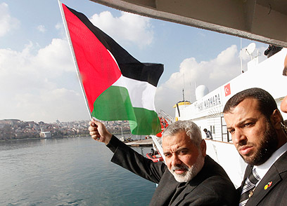 Hamas Prime Minister Ismail Haniyeh on the deck of the Marmara (Photo: Reuters)