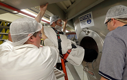Rabbi Herman wears harness for safety while being lowered to inspect machinery used for enzyme production for kosher products (Photo: AP)