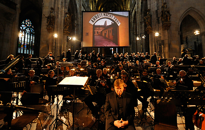 Terezin concentration camp entrance seen behind orchestra (Photo: AP)