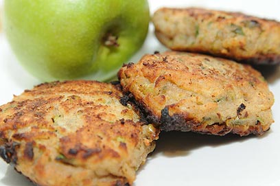 Scoop up the apple mixture by heaping tablespoons; gently drop into the pan, using the back of a tablespoon to flatten it. Don't crowd the pan. Fry the latkes until golden, 1 1/2 to 2 minutes per side. Drain them on a cookie sheet lined with a paper bag. Continue with remaining batter. Let them cool, about 15 minutes. If the batter gets very watery halfway through the frying, add a tablespoon of flour to the mixture and mix it in.