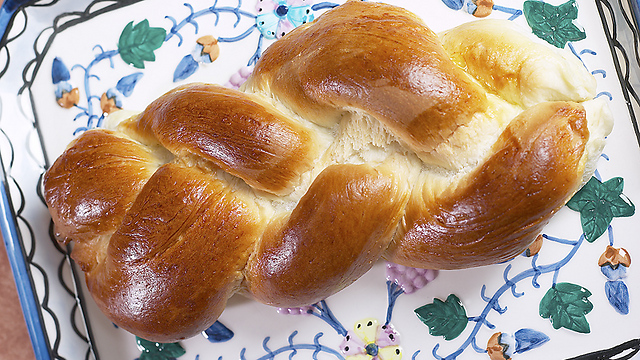 After you’ve braided your challah loaves, place them on two separate cookie sheets lined with parchment paper. Prepare your egg wash by beating the egg yolks and water till smooth. Use a pastry brush to brush a thin layer of the mixture onto the visible surface of your challah. Preheat the oven to 350°F (175°C). Let the braids rise 30 to 45 minutes longer. You’ll know the dough is ready to bake when you press your finger into the dough and the indentation stays, rather than bouncing back.