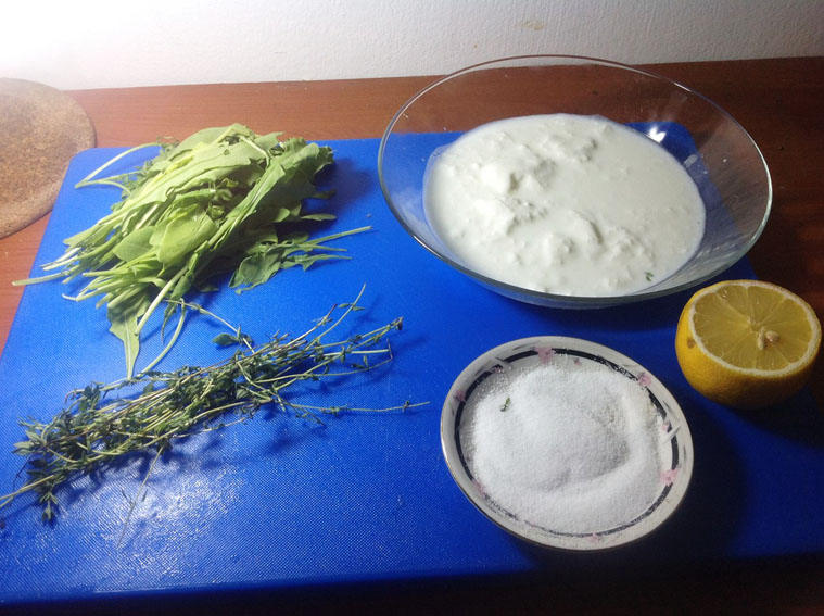 4. Приготовить соус: мелко нарезать рукколу и добавить в йогурт. Добавить также все остальные ингредиенты, постоянно пробуя на вкус, тщательно смешивая.