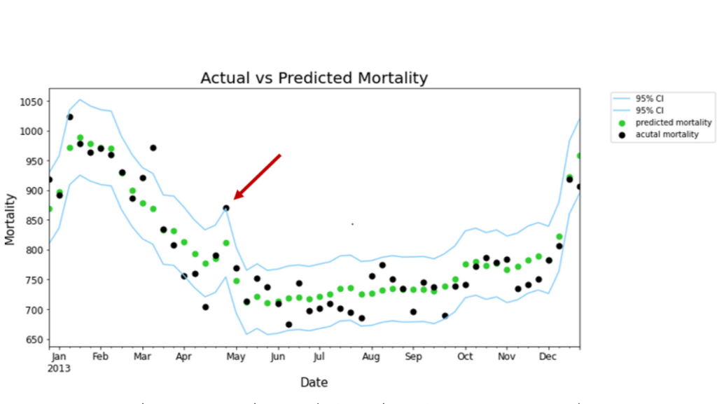 An example (marked in a red arrow) of predicted mortality (811) and actual mortality (873) during a heatwave that began in April 2013 in Israel