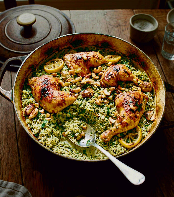 The golden pot: Lemon-garlic herb chicken with green rice and cashews