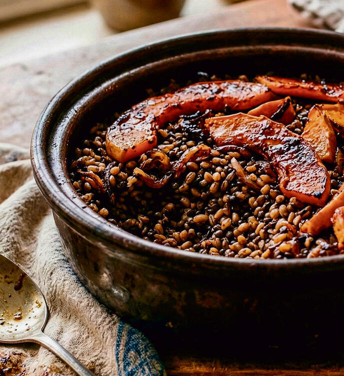Aside from frying the onions, nothing needs pre-cooking. Everything goes straight into the oven for a true set-and-forget meal. Barley likes time to cook, so it requires little supervision. Wheat berries can also be used, or even combined with the barley.