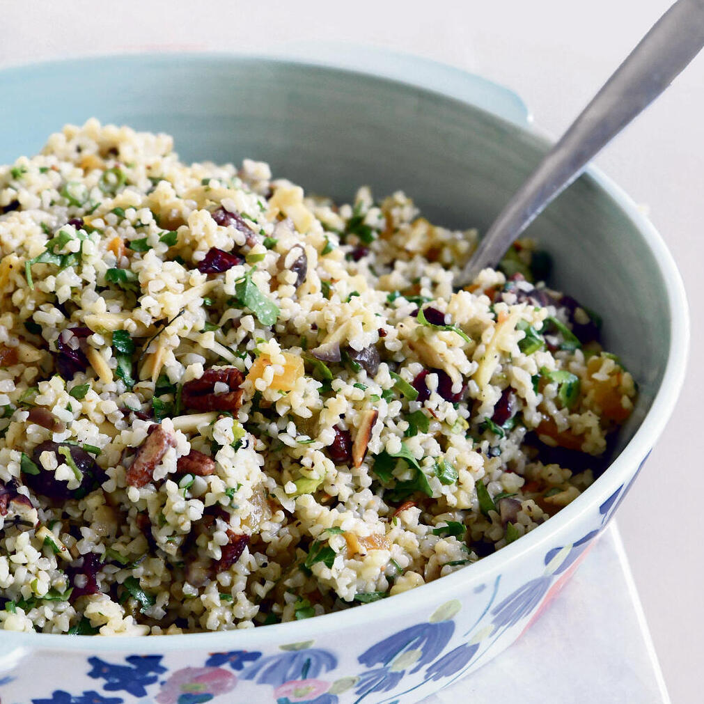 Bulgur salad with dried fruit, almonds and chestnuts in tahini-orange dressing