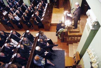 Archbishop Jukka Paarma and Archbishop Leo, the leaders of the Lutheran and Orthodox churches also attended ceremonies, which gathered a few hundred people to the pale yellow - shade synagogue in downtown Helsinki.