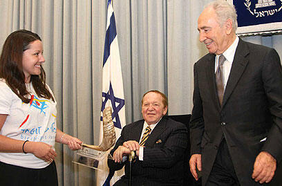 From Left to right: Taglit rep, Sheldon Adleson, Shimon Peres (Photo: Sivan Farag)