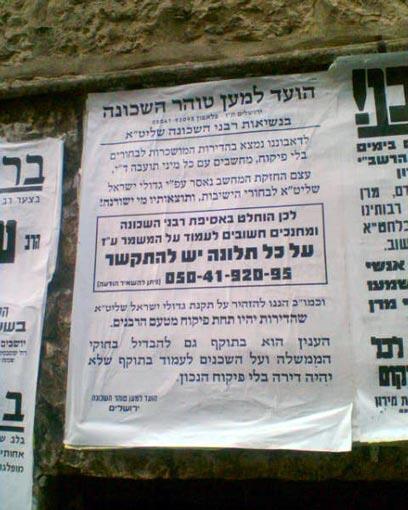 "Regretfully, computers containing all sorts of to'eva have been found in apartments that have been rented out to the boys (yeshiva students) without supervision," the posters read. "Gedolei Yisrael (most revered rabbis of the generation) have forbidden yeshiva students from owning computers, and therefore it was decided during a meeting of neighborhood rabbis and educators to stand guard. To file a complaint call this number…"
