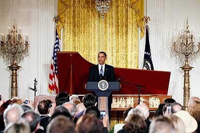 This was one of the busiest days in Obama's busy schedule, with the ecological disaster in the Gulf of Mexico looming over the proceedings. But an hour was found for a reception, the first of its kind, to mark Jewish Heritage Month in the US. In the main hall on the eastern wing, the US president honored Jews who had contributed to arts, music, sport and science.