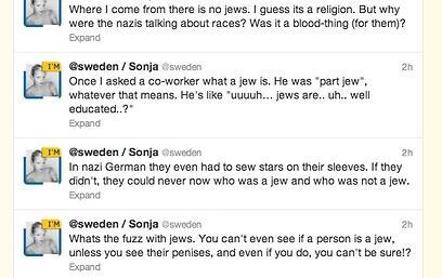 "What's the fuzz with Jews" she asked in one tweet on the (a)sweden account, suggesting it's hard to tell them apart from other people and then went on to joke about Jewish circumcision.