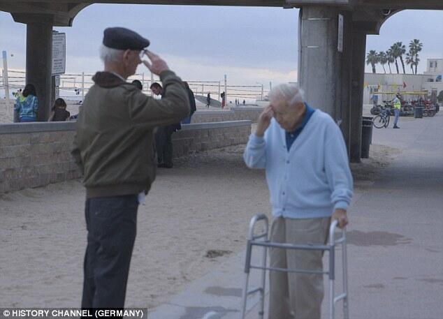 Holocaust survivor Joshua Kaufman salutes Daniel Gillepsie, the man who rescued him from Dachau