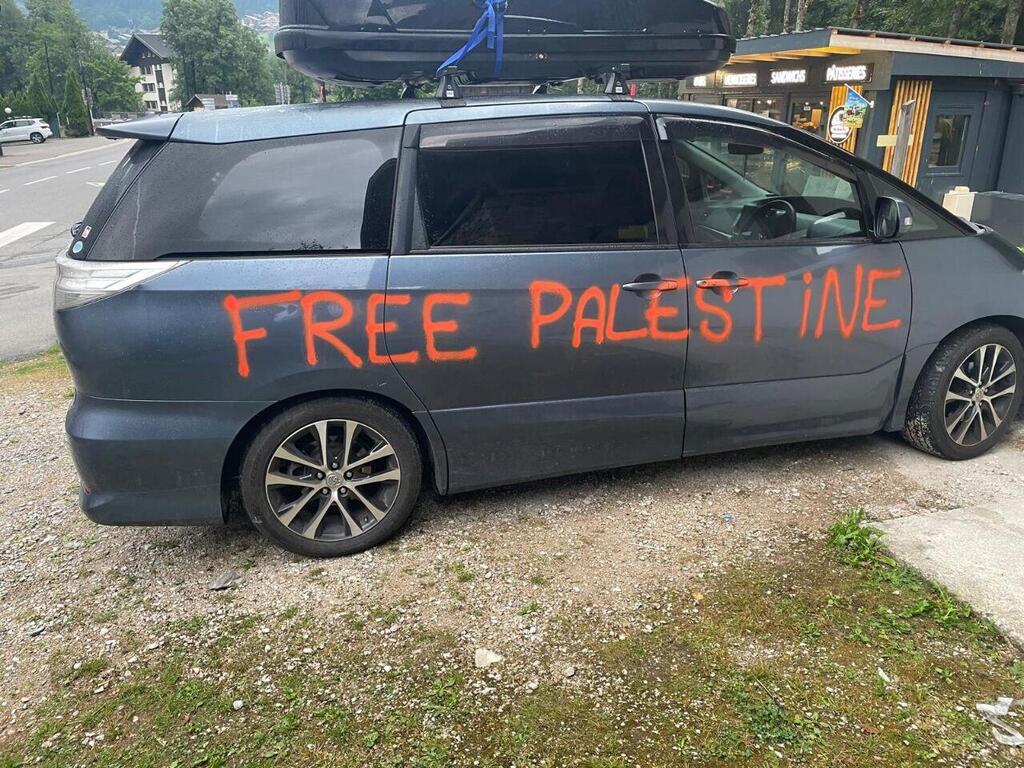 Orthodox Jewish families from across Europe, vacationing in the village of Châtel in the Auvergne–Rhône–Alpes region of France, near the Swiss border, discovered that vandals had spray-painted the slogan “Free Palestine” on nine of their cars.