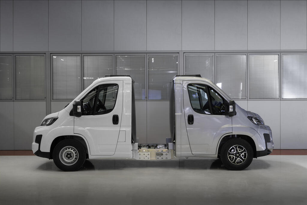 Each half of the dual-cab unit contains a complete cab and drivetrain. Once transported to conversion workshops, the pair is separated and each cab is mounted onto its own rear chassis and axle, customized to meet specific motorhome designs.