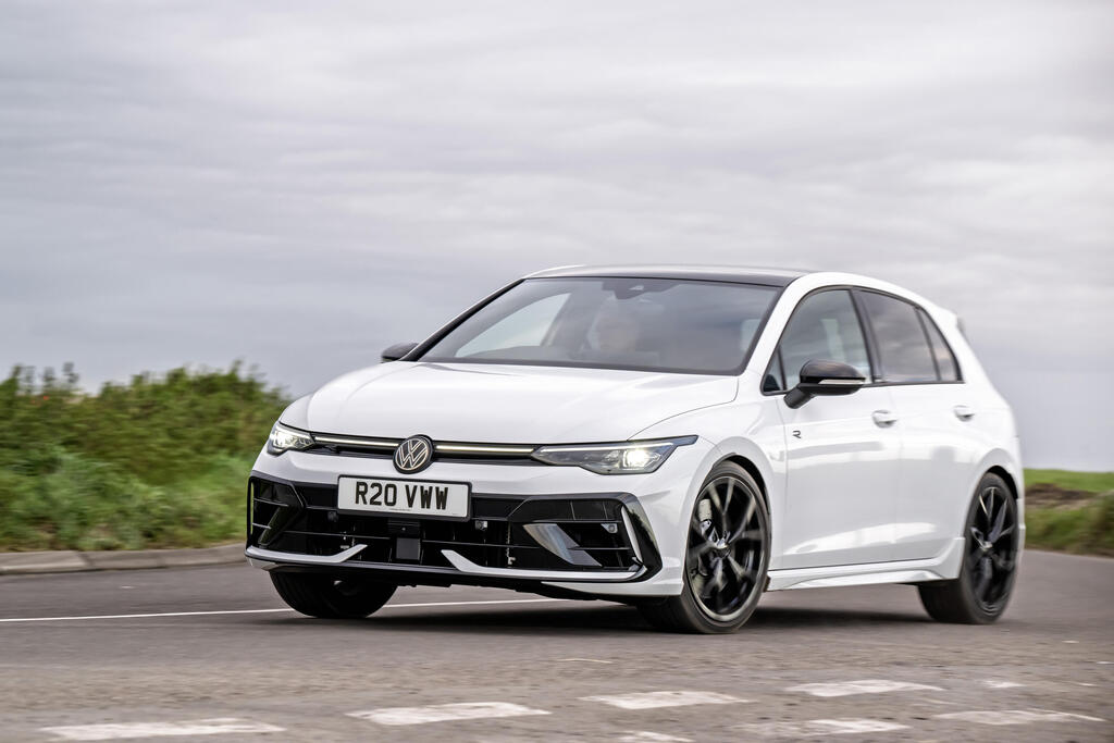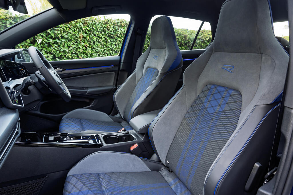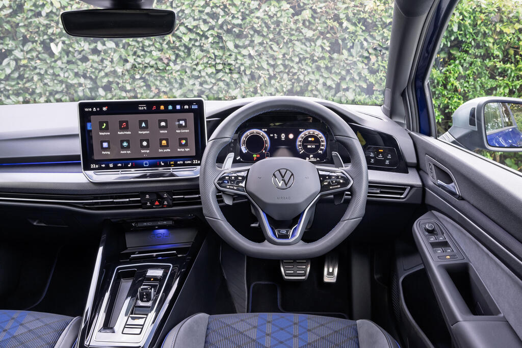 There’s a prominent R button on the steering wheel, and the paddle shifters are bigger than those in the GTI. Like in the regular facelifted Golf, there’s a large 12.9-inch touchscreen with a faster, improved interface — but it still has those maddening touch controls for climate temperature and volume, including on the steering wheel.