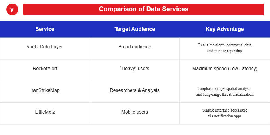 Israel’s market, which has effectively become the world’s largest testing ground for warning technologies, now offers a wide range of solutions. On one side, established media organizations such as ynet have integrated advanced data components that allow users to access geographical and quantitative information about air raid sirens.