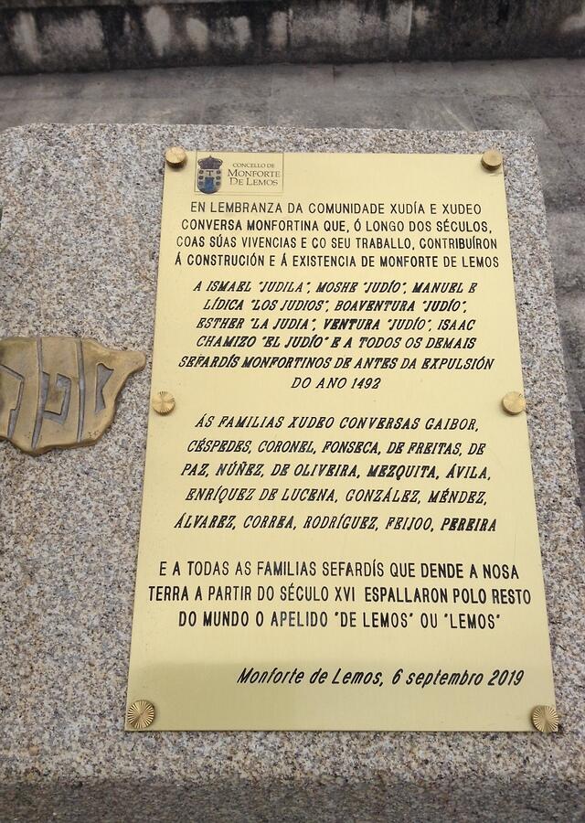On the other hand, I did arrive just in time to see a moving plaque that had been dedicated exactly 18 days earlier to the memory of the generations of Jews that had lived in Monforte de Lemos before their exile -- specifying common first names as well as last names associated with “conversos,” and culminating in a tribute to those in the Diaspora who had subsequently incorporated Monforte or Lemo(s) in their surnames.