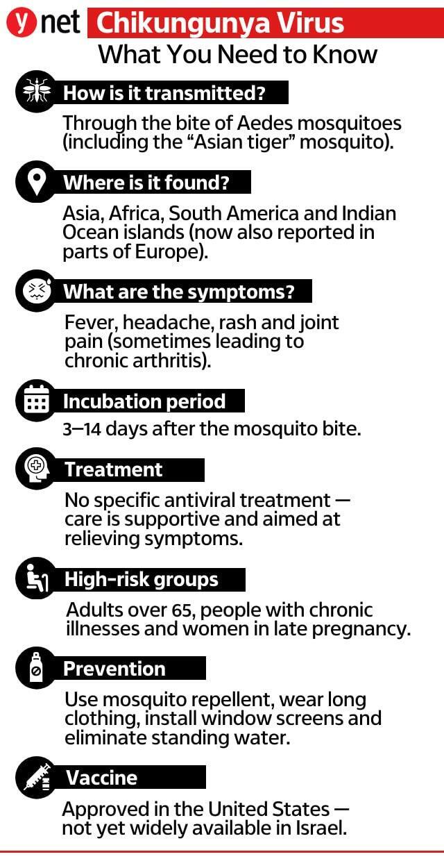 In a late July interview with ynet, Professor Eyal Leshem, an infectious disease specialist at Sheba Medical Center, said that between five and 10 cases of chikungunya are diagnosed in Israel each year — so far all among travelers returning from abroad. However, he emphasized that the mosquito species that transmits the virus is also present in Israel: “Just as it happened in Italy or France — it could happen here as well.”